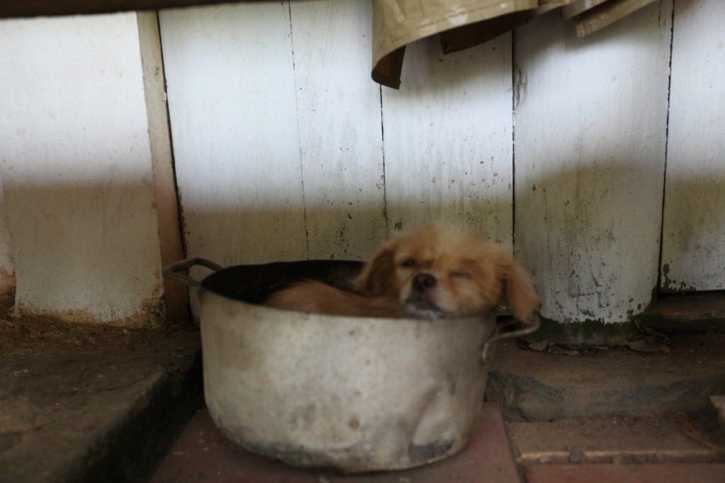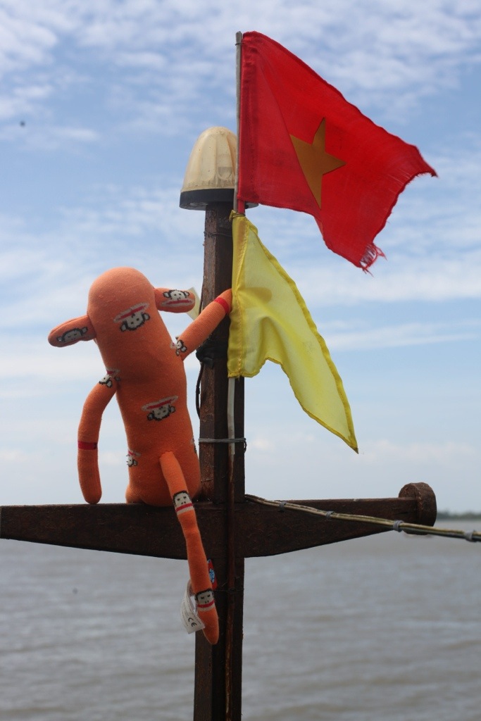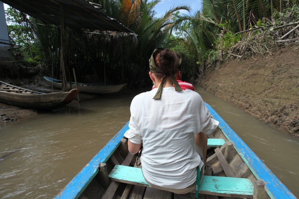 In My Tho gehen wir an Board eines kleinen Bootes. Auf dem Boot lebt eine Frau mit fünf Kindern. Ihre anderen fünf Kinder leben bei ihrem Mann am Land. Kaum zu glauben, dass soviele Menschen auf diesem Boot Platz haben!