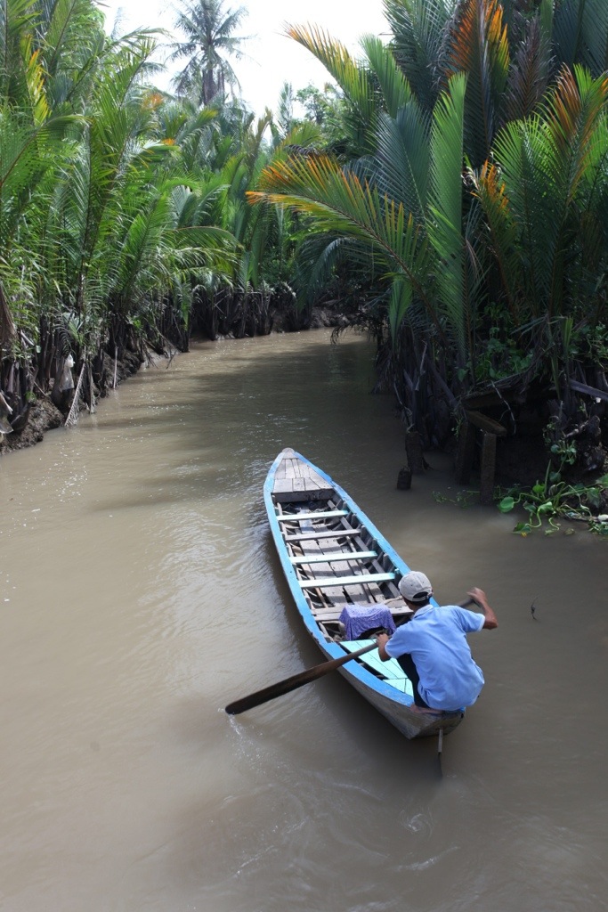 Nix mit ausschlafen: es geht mal wieder früh los. Wir werden mit einem Minibus vom Hotel aus abgeholt. Unser Guide spricht hervorragendes Englisch und so wird die Fahrt ins Mekong Delta sehr kurzweilig. Wir hätten einfach alles aufschreiben sollen, dann hätte es einen lustigen Reiseführer gegeben. Er erzählt uns viel über die politische und persönliche Lage in Vietnam. Das Land ist zwar fest in kommunistischer Hand aber der Handel ist eine mehr oder weniger freie Marktwirtschaft. Auch einige unliebsame Gesetze werden recht demokratisch wieder „abgewählt“! Es klingt nach einer sehr bunten Mischung der verschiedensten Systeme.