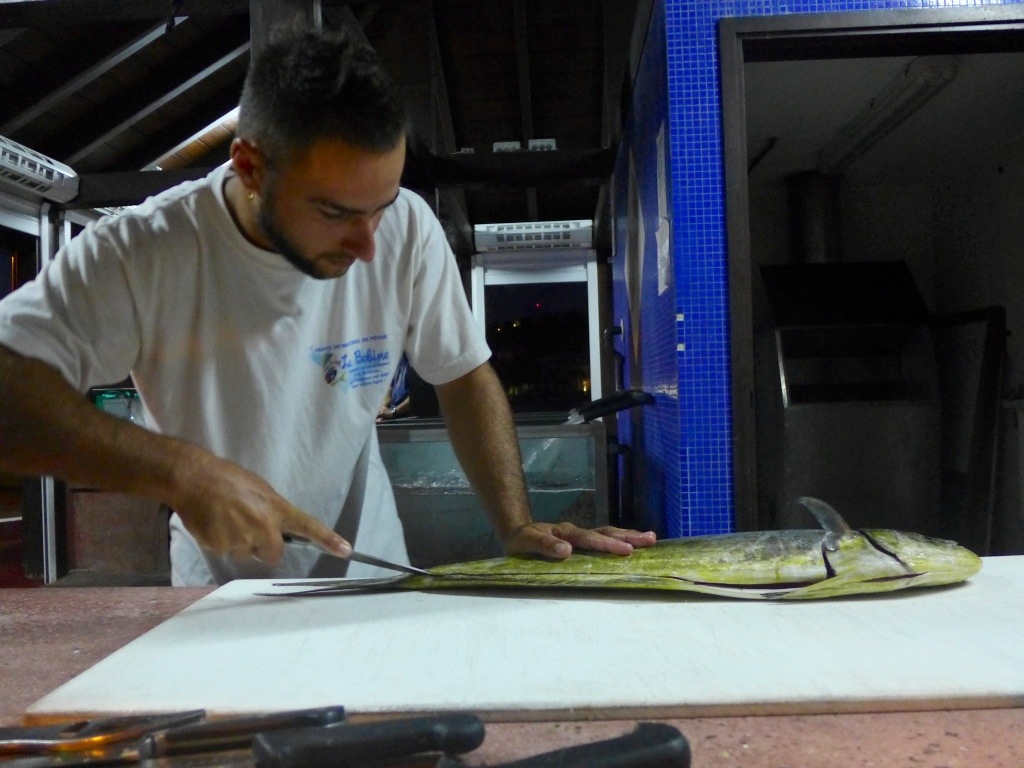 Wir entscheiden uns für letzteres. Vom Fachmann wundervoll vor unseren Augen filletiert. Die Haut bleibt dran, damit ich heute Abend Klaus‘ Ratschlag gleich in die Tat umsetzen kann.