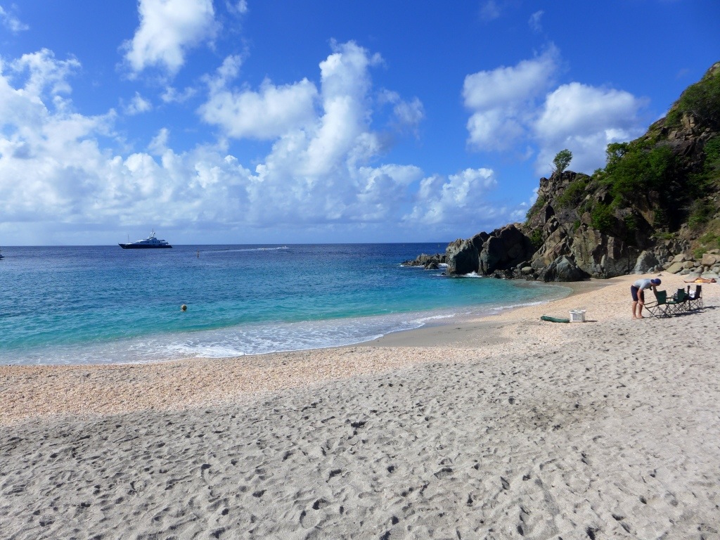 Für den heutigen Tag nehmen wir uns neue Strände vor: den Shell Beach auf der Rückseite von Gustavia zum Beispiel. Noch ist Vormittags nicht viel los hier aber auf dem Weg treffen wir bereits einige mit Strandtaschen gewappnete Sonnenanbeter, die die gleiche Richtung eingeschlagen haben wie wir. Die Bucht sieht sehr hübsch aus und tatsächlich besteht der Strand aus Millionen kleiner Muscheln. Das sieht hübsch aus, ist aber nicht so toll für die Füsse.