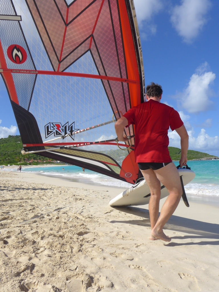 Gut gestärkt bilde ich mir ein, ich könnte es mit den Wellen am Hausstrand aufnehmen. Es geht ein tüchtiger Wind und so miete ich mir ein 4,5 Quadratmeter Segelfläche mit einem etwas wackligeren Untergrund.