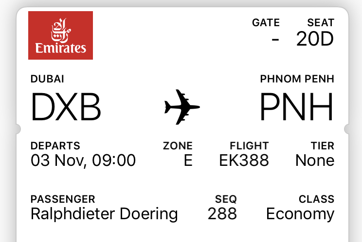 In Dubai angekommen verbringen wir die Nacht mal wieder am Flughafen. Nicht ganz so voll, wie beim letzten Mal aber dafür genau so unbequem. Um 9:00h geht unser Flieger über Myanmar nach Phnom Penh. Wir haben Glück und dürfen uns an den Notausgang setzen.