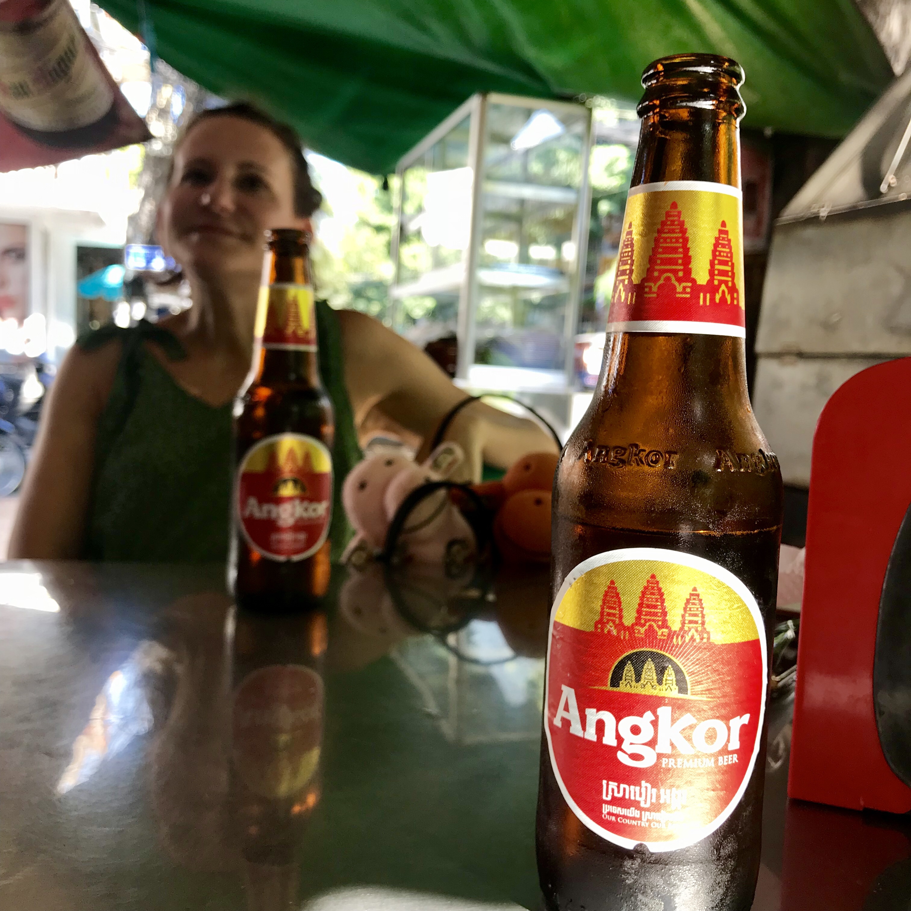 Zum Mittagessen genießen wir ein kühles Angkor. Ich probiere das Kambodschanische National Gericht: Lok Lak – Rindfleisch auf Zwiebelbett mit Reis.