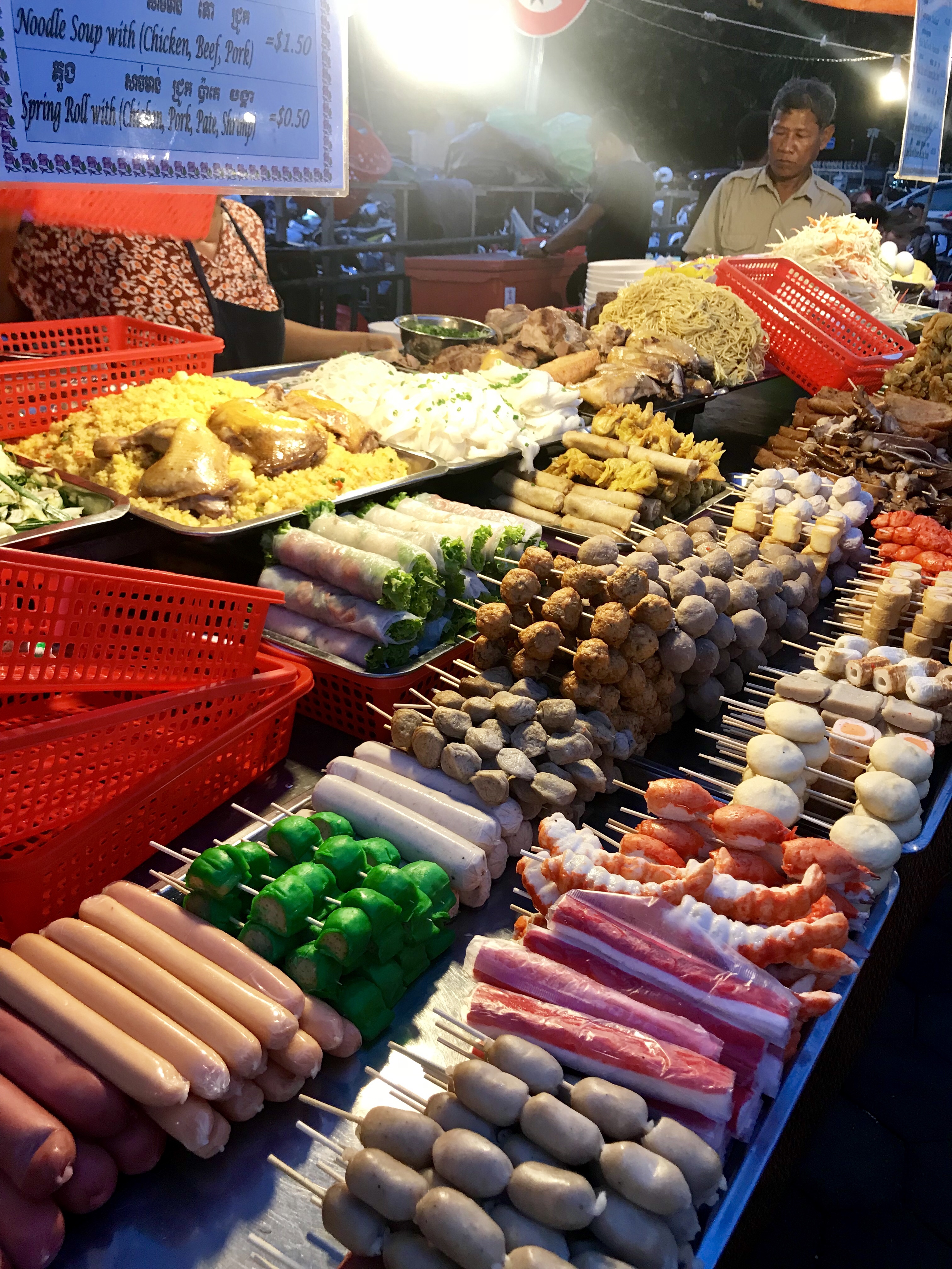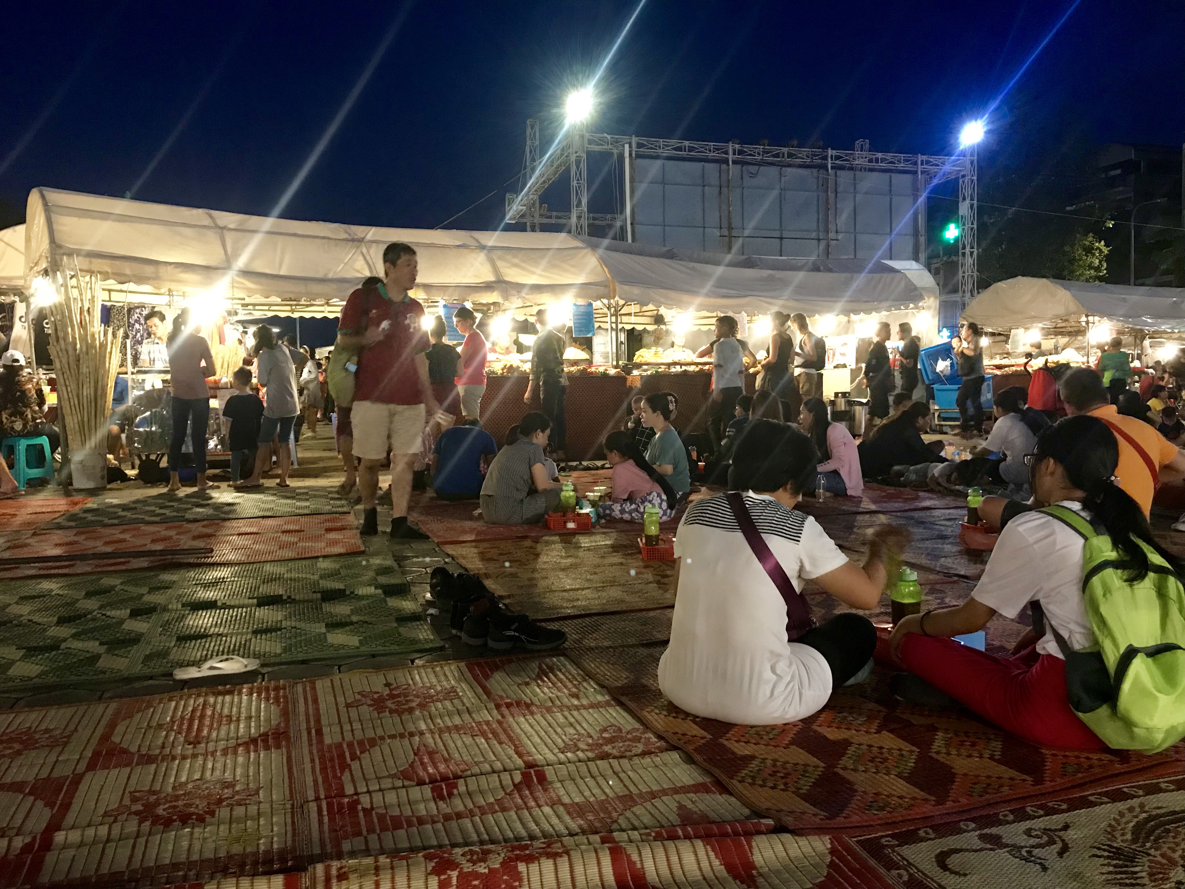 Auf dem Nachtmarkt werden hauptsächlich Klamotten und warme Speisen angeboten. In der Mitte der Stände liegen bunte Matten auf denen man es sich mit seinem Essen bequem machen kann.