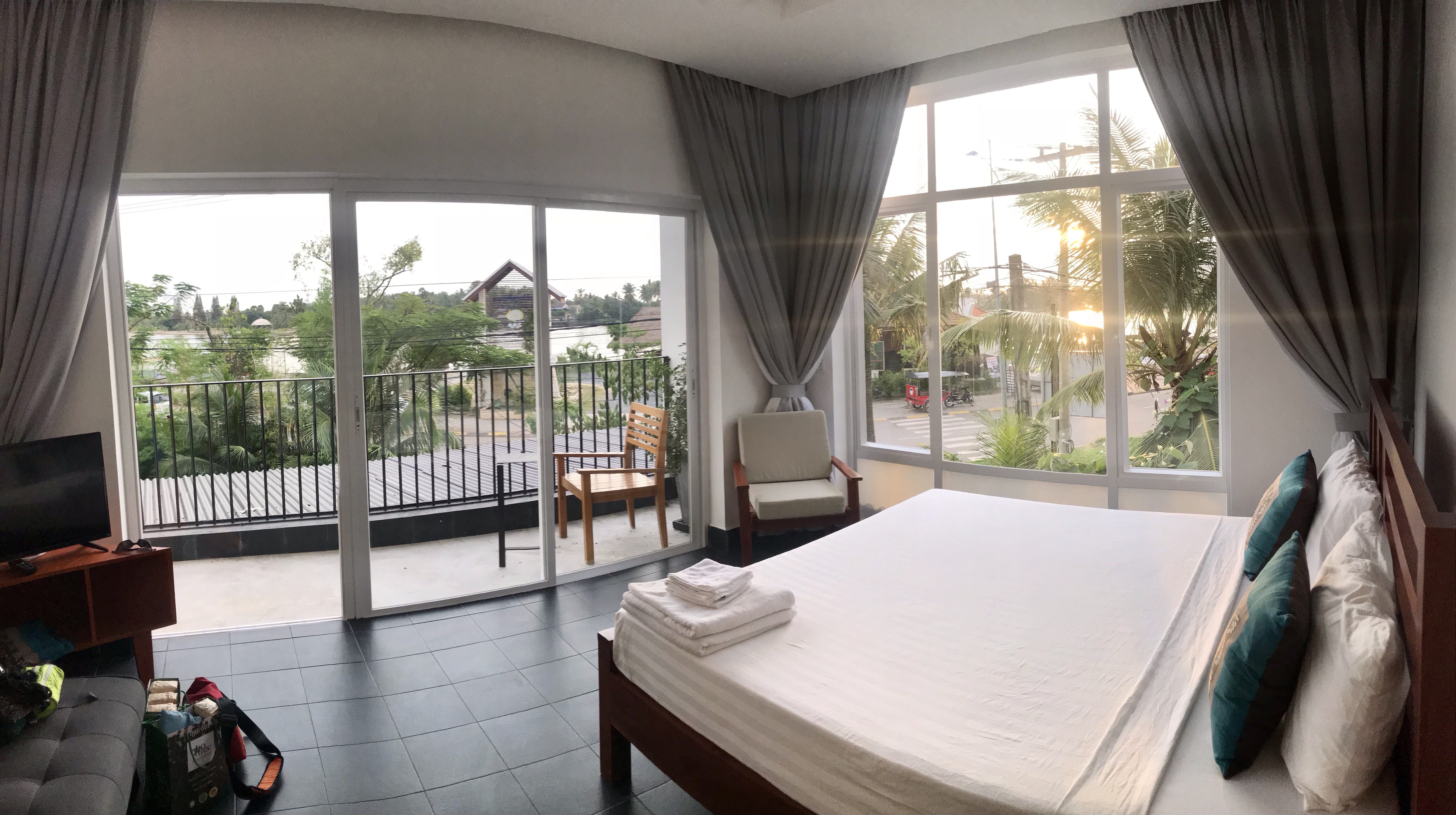 Kurz bevor ein kleiner Regen einsetzt und die Sonne untergeht sind wir wieder in unserem Zimmer. Es hat nicht nur einen tollen Blick, sondern auch die leiseste Klimaanlage von allen.